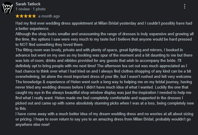 Explore our social media platforms or visit our shop in person to experience our unique approach. At Milan Bridal, we strive to create a memorable and personalized experience tailored just for you. The day is yours, and we can't wait to be a part of your bridal journey.